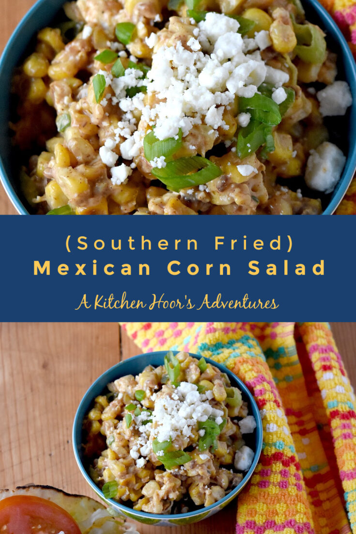 (Southern Fried) Mexican Corn Salad is a combination of southern style fried corn and Mexican corn salad. The corn is caramelized with butter, then cooled and combined with Mexican corn dressing.