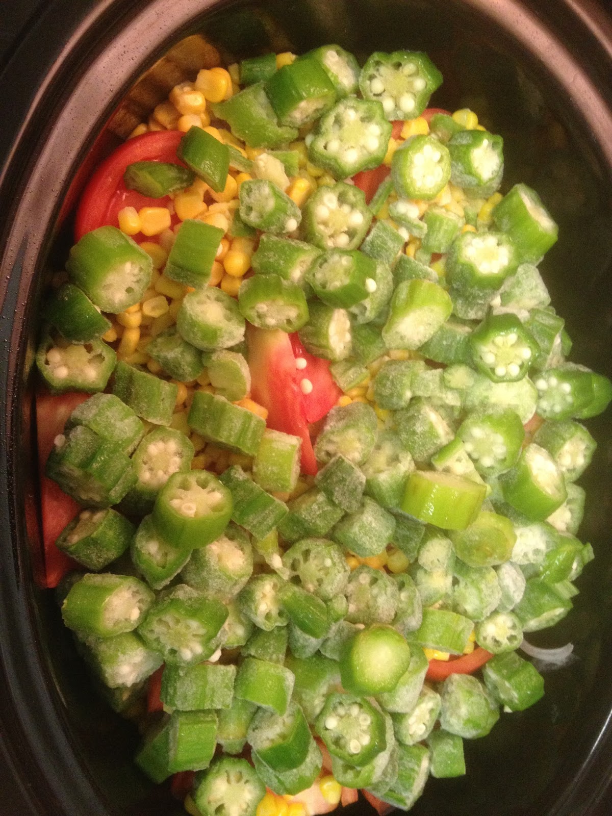 - Place the chicken thighs on top of the squash. Top with tomatoes, chiles, corn, and okra.