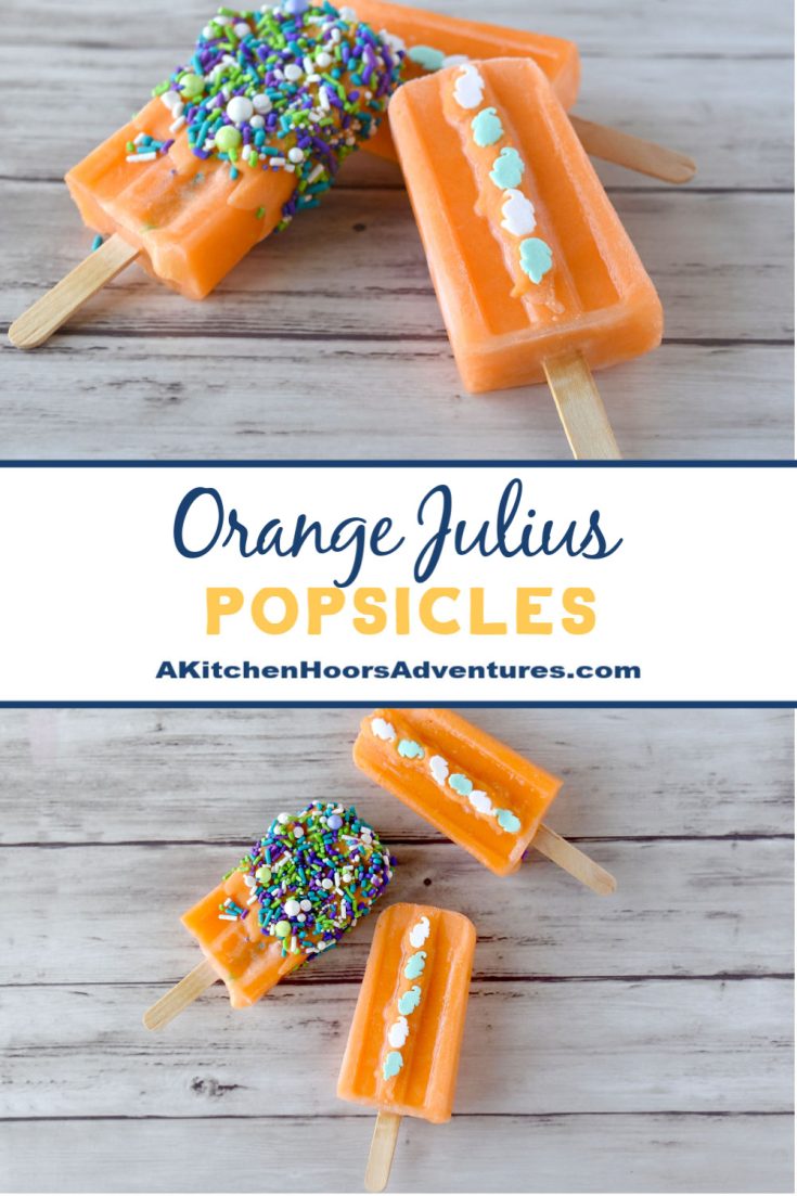 Orange Julius Popsicles are the color of a goldfish, but taste orangey and creamy. To play off the color, they’re decorated with Sweets & Treats Boutique seahorse quin sprinkles and sea splash sprinkles mix.